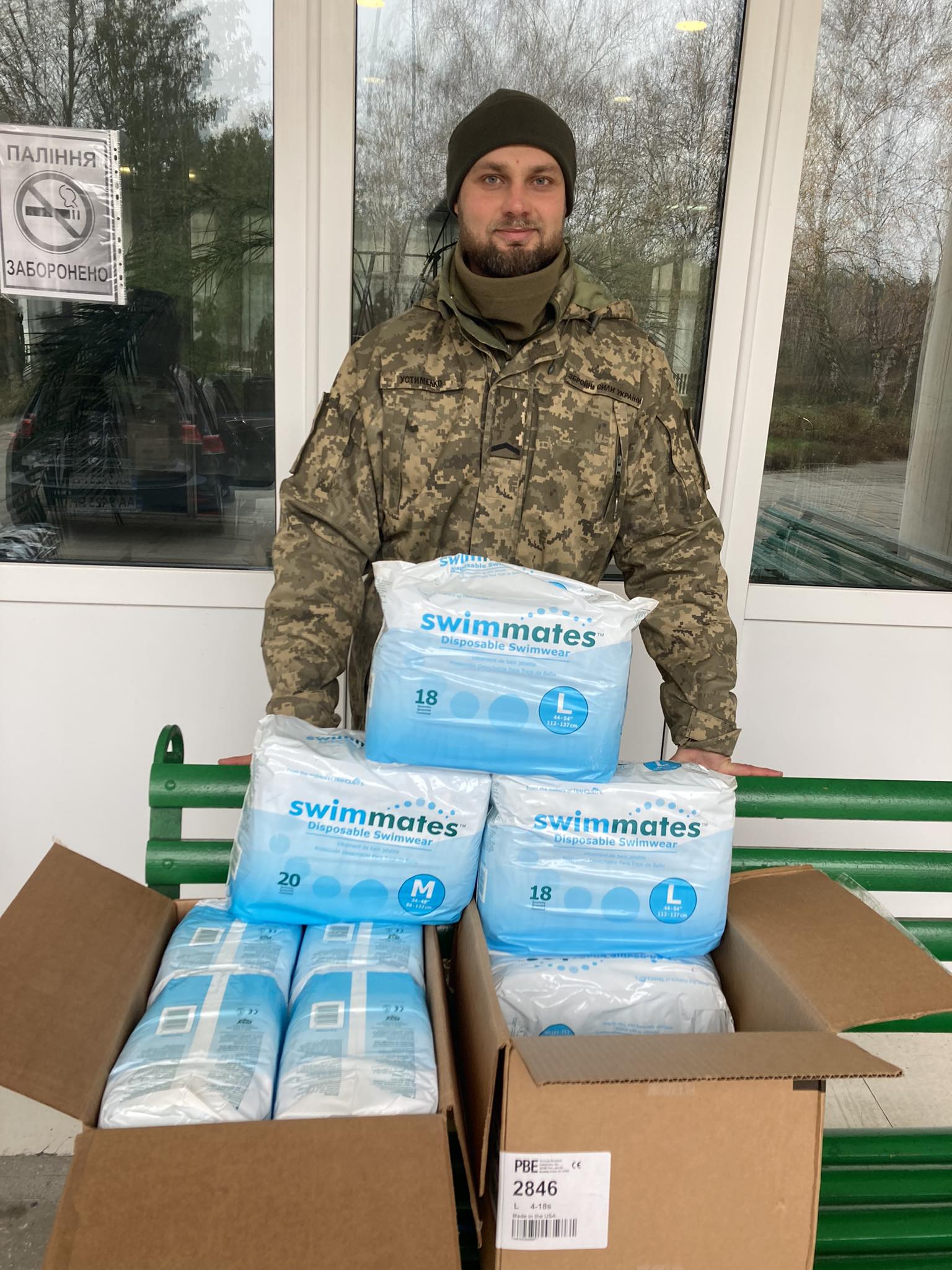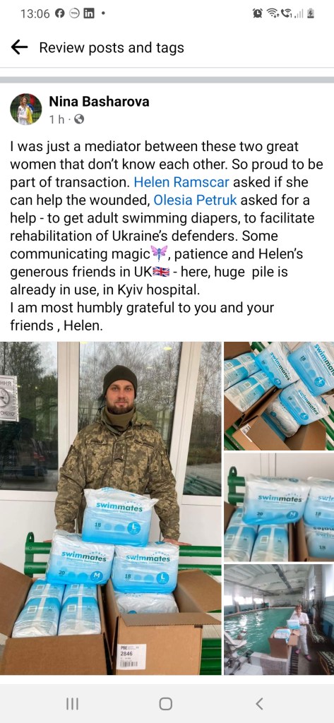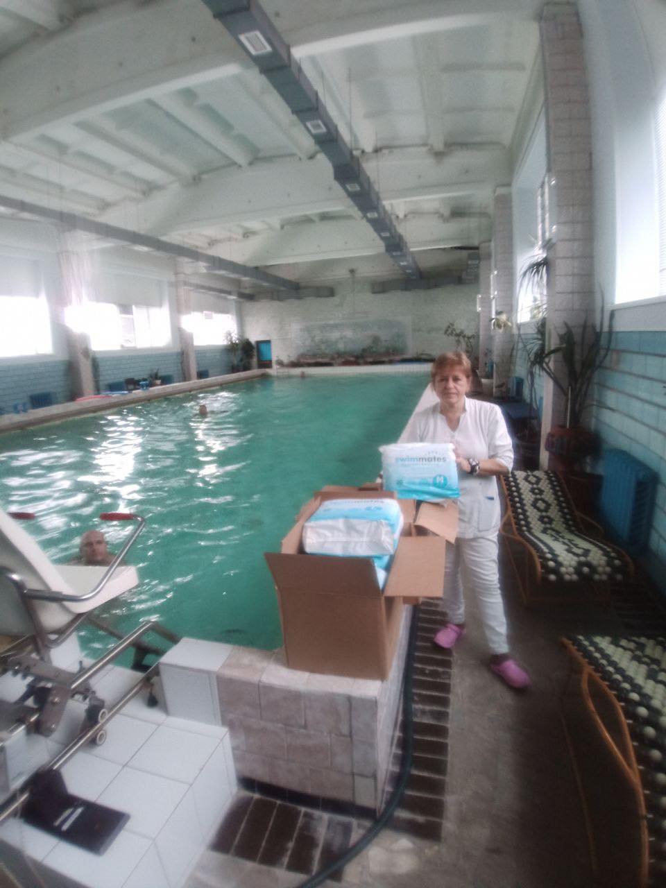 In November 2023, ten packs of disposable adult nappies ordered by Ambulance Relief reached this swimming pool inside Kyiv. This donation is for injured, in some cases amputees, who need them in order to exercise in the water with dignity and discretion – as part of their long and arduous personal journey towards rehabilitation. They have lost so much in this cruel war.